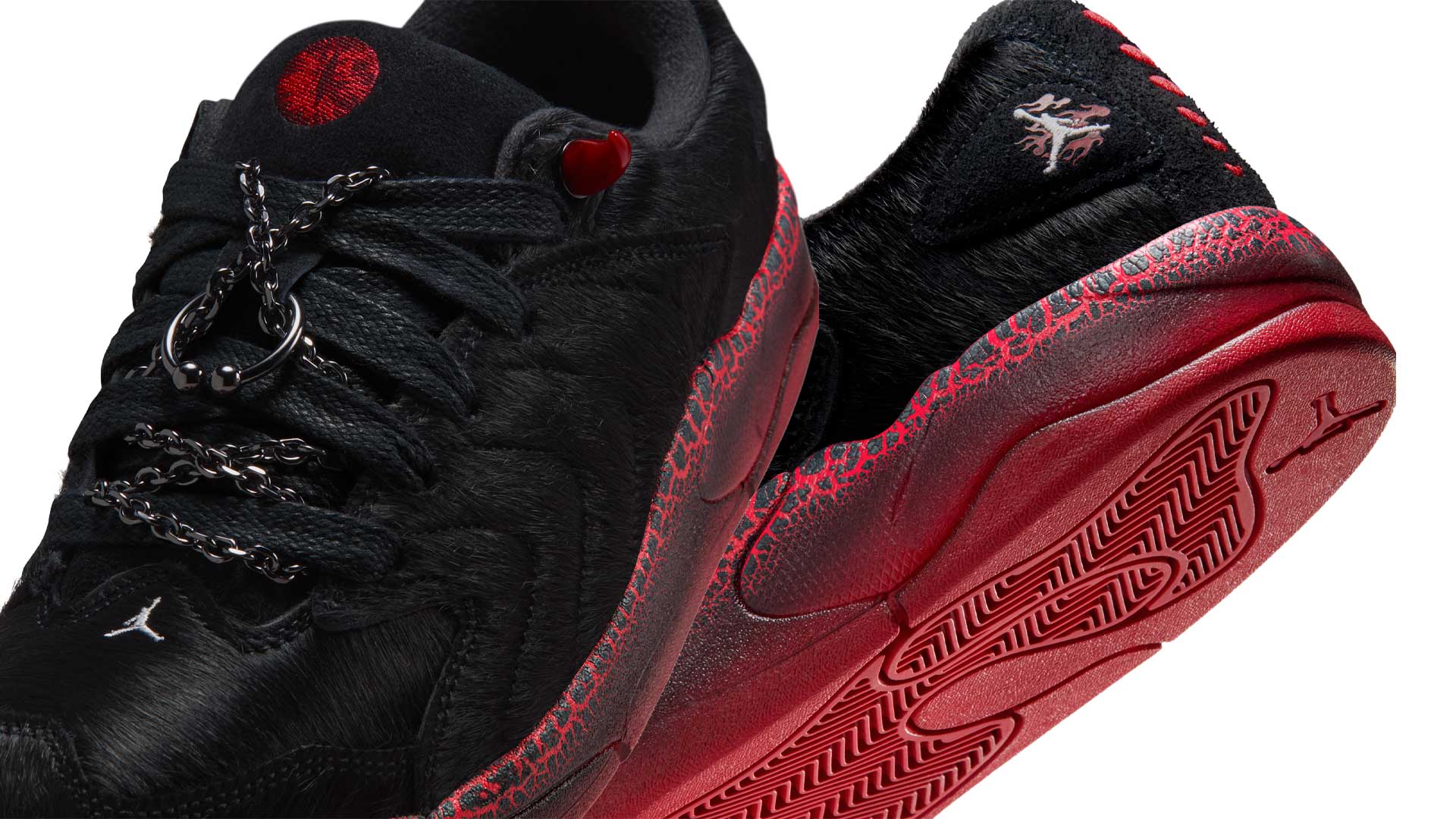 So what is the Jordan Session Black/Fire Red/Fire Red supposed to be? Strip away the hysteria and you’ve got a skate-inspired low-top that moves Jordan Brand beyond the hardwood. Versions of the Session have been floating around quietly for months, but this “Black/Fire Red” edition is easily the strangest. Faux pony hair dominates the upper, a fiery graphic wraps the sole, and the horns, well… they’re not going anywhere.