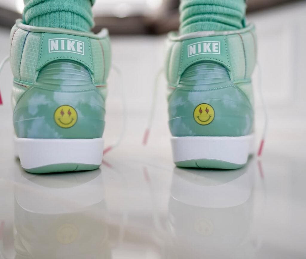 The sneaker boasts a sage green upper with smooth leather at the base of the design and snakeskin leather on the overlays. The shoe also features a whimsical cloud detail from the midfoot to the heel, adding a touch of playfulness. Other highlights include white laces with pink accents, multicoloured stitching, and a white midsole below. The most notable features of the collaboration, though, are the translucent glow-in-the-dark outsoles underneath and the green LED on the wings logo at the tongue, setting it apart from other AJ 2 designs.